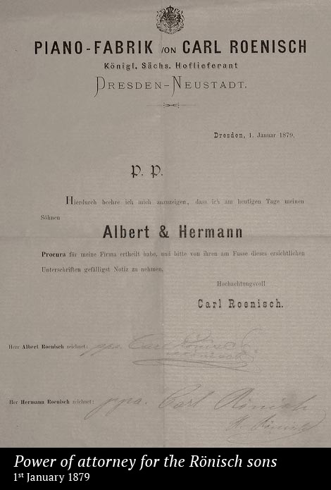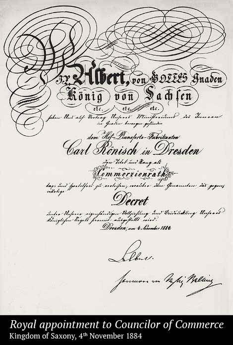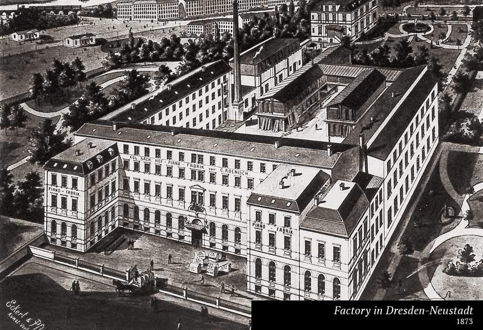 1857年にはザクセンで最初のベビーグランドピアノを製造。3台のグランドピアノをザクセン王の宮殿に届けた後、1859年に王室御用商人に指定される。